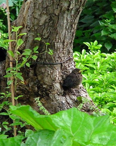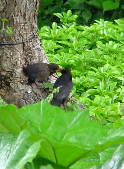 Helaas blijk ik, als beginnend-vogelaar, geen schokkende ontdekking te hebben gedaan, toen ik vastlegde hoe een mereljong door de vader werd verzorgd. 'Er is door de Engelsman Snow ook onderzoek gedaan naar het opvoedgedrag bij de merelouders. Het schijnt dat zodra de jongen het nest kunnen verlaten en dus vliegvlug zijn de jongen als het ware worden opgedeeld tussen de vader en de moeder. Zij zorgen beide onafhankelijk van elkaar voor de jongen, voeden ze en brengen ze ervaring bij, iets wat ik maar zal noemen moeders- en vaderskinderen. Komt een moederskind zijn eigen pa weer tegen dan schijnen zij van elkaar vervreemd te zijn en worden deze jongen door pa niet meer verzorgd.' Dank voor alle merelinformatie. Stand van zaken: het mereljong kan fladderen en heeft zich buiten kattenbereik gesteld; de vader blijft onvermoeibaar bezig.