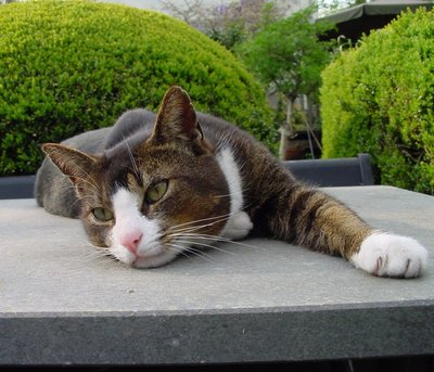 Ze zeggen dat de vakantie bijna is afgelopen. Jammer. Want voor ons is het toptijd. Elke avond feest. Hier in de wijk ken ik zes huizen waarvan de bazen afwezig zijn en waar het luikje openstaat, omdat de buren oppassen en eten geven. En die buren willen het goed doen, dus die scheppen altijd teveel eten in de bakjes. Met de zes kennissen en vrienden van de vakantiehuizen hebben we afgesproken dat we elke avond de vakantiehuizentocht maken. Joh! Ik ga dus elke avond uit eten. En ik krijg menu's voorgeschoteld die ik in eigen huis nooit krijg. Zalmsnippers! Gekookte kabeljauw (niet die goedkope wijting)! Luxe brokjes met muizensmaak! En soms blijven we slapen op het laatste adres. Mogen we om beurten in de soms heerlijke, lekker zacht beklede mandjes van de collega's. Gisteravond was Poeke niet van de partij. Haar bazen zijn al terug. Dus ze moest binnenblijven. Kopjes geven, spinnen, op schoten zitten - laten zien hoe blij ze is dat ze weer terug zijn. Maar wij weten wel beter. Toen ik vanmorgen na het eetfeest dikgegeten op huis aanging, passeerde ik Poeke's stek. Ze zat voor het raam van de voorkamer naar buiten te staren. Ze leek me niet te zien. Begrijp ik best. Over een week of wat ben ik ondergedompeld in hetzelfde heimwee. Als de vakantie erop zit, gaan we weer met elkaar vechten. Bah! Helemaal geen zin in. Gerrit