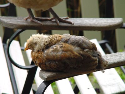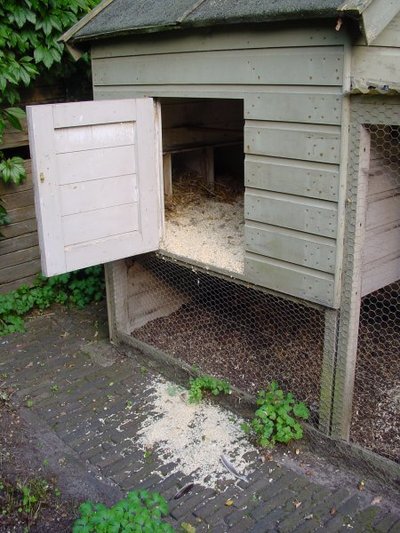 In Nederland zijn 30 miljoen kippen aan het werk om u van eitjes te voorzien; 25 miljoen verblijven in legbatterijen, de rest scharrelt. Mooie column van Koos van Zomeren in het Zaterdags Bijvoegsel van NRC-Handelsblad (Mazzelkippen). Ik leerde dat het verschil in welzijn tussen legbatterij- en scharrelkippen klein is. In beide systemen wordt nog steeds snavelkappen toegepast - het afknippen van de snavel, net voor het neusgat, pijnlijk en een dagelijkse hinder voor de kip. (Vanaf 2006 wordt een begin gemaakt met verbieden; in 2011 behouden alle kippen hun snavels.) In ons land worden 150.000 kippen gehouden in optimale omstandigheden, met hele snavel. Van de gehele kippenbevolking mogen we dus een half procent 'gelukkige kippen' noemen. De meeste pluimveehouders laten de opfok over aan het speciale broedbedrijf. 'Dat kuikens van de kloek leren hoe het is om kip te zijn, zie je alleen nog bij hobbyisten,' schrijft Koos van Zomeren. Trots toont Bieslog de nieuwste aanwinsten die hier rond het redactielokaal scharrelen: drie gelukkige kuikens. Al weken is de moeder bezig met haar kip-lessen. Graaft zij iets eetbaars uit de grond, dan roept zij de jongen, die zich piepend op het wormpje of zaadje storten. 's Nachts neemt de moeder haar kinderen nog onder haar vleugels, maar ze worden er te groot voor, ze steken met hun koppen onder het dekbed uit. Kijk's goed: er bungelt een veer aan moeders vleugel. Heeft ze gevochten? Is een passerende kat te dicht in de buurt gekomen? Moeder-kloek is er als de kippen bij om haar jongen te verdedigen; de kat schrikt hevig van deze explosie van kippendrift en maakt dat'ie wegkomt. In de bio-industrie zouden kuikens van deze leeftijd al tot zwaargewichten zijn opgefokt en opgegeten. Gelukkige kippen kunnen tussen de vijftien en twintig jaar oud worden. Dit stukje dient niet ter demonstratie ('O, o wat zijn wij toch goed voor dieren!'). Maar gelukkige kippen zijn zo zeldzaam dat ze best eens in de krant mogen.
