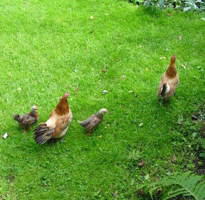Deze foto maakte ik gistermiddag, in de nabijheid van het Bieslogredactielokaal. De bovenste kip is de moeder van de andere - grote kuikens, waaronder al duidelijk herkenbaar, twee haantjes. Vanmorgen, bij het eerste daglicht, rond half zeven, is een vos het terrein op geslopen, die de drie kuikens heeft gegrepen en weggevoerd. Er resten wat veertjes. Nu, enkele uren later, loopt de moederkip zoekend rond. Als ze iets eetbaars in het gras vindt, pikt ze het niet zelf op; ze maakt een klokkend geluid, waarmee ze haar kinderen roept.