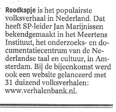 We laten ons niet verleiden tot flauwe grappen, maar dat een politicus bekendmaakt dat Roodkapje het populairste sprookje is, heeft wel tot gevolg dat het site-adres van de verhalenbank in de krant staat. Zo worden we geattendeerd op de Nederlandse Volksverhalenbank van het Meertens Instituut en dat is goed. De bank bevat momenteel 31441 verhalen. Van Roodkapje zijn 39 varianten opgenomen - ook parodieën, moppen en Broodje Aap-verhalen krijgen een bronvermelding. 'Jip en Janneke spelen het sprookje van Roodkapje na. Jip schiet echter telkens in de lach als hij hoort dat Roodkapje sigaren naar haar oma gaat brengen. Dan besluiten ze om het spel te staken.' (Deel 1 van Jip en Janneke door Annie M. G. Schmidt)