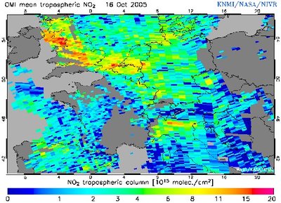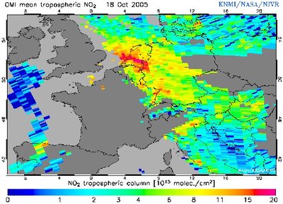 Elke dag meet satelliet OMI de luchtvervuiling boven West-Europa: ozon, fijnstof, stikstofoxiden en uv-straling Op een site van het KNMI worden die metingen nu elke dag aanschouwelijk gemaakt.