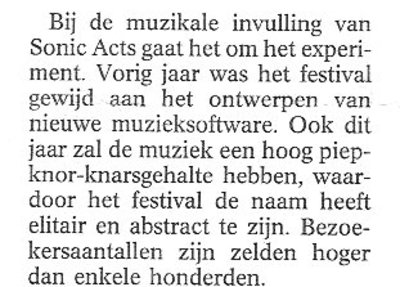Of het lukt daarmee een brug te slaan naar 'een nieuw publiek' is de vraag. Het nieuwe publiek begint - net als het oude publiek - schoon genoeg te krijgen van die gasten in hun enkele hemmetjes met die petten op en hun gespuug in de microfoons en hun nu al vijftien jaar durende kwasi-swingende herkauwen van steeds weer dezelfde clichés in woord en gebaar. Alleen de directeuren van de grote orkesten en concertzalen denken nog met iets zeer 'moderns' bezig te zijn.