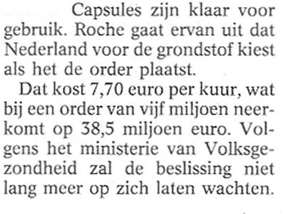 'Er kompt een griepgolf aan - dat wil je niet weten. Dan gaan miljoenen de pijp uit. Maar als je een eenvoudig capsuletje inslikt, ontspring je de dans. De golf kan ieder moment aankomen en wat doet de regering? Die wacht af. Ja, ze denken erover vijf miljoen porties spul te kopen - Tamiflu heet het - en dat kost bijna 40 miljoen. 'De beslissing zal niet lang meer op zich laten wachten.' Ja, dag! Dat kennen we. Over een jaartje of twee zijn ze uitvergaderd. Ik wil dat capsuletje potverdee nóu hebben! Ik ben erachter gekomen dat Tamiflu wordt gemaakt in Amerika door de fabriek van Roche. In Nutley is dat, een plaatsje in New Jersey. Nou had ik zo gedacht: ik vertrek morgen naar de States, huur een auto, ga voor de fabriekspoort in Nutley leggen en ik ga daar niet weg voor er een behoorlijke kwak Tamiflu in m'n achterbak is geplempt. Wil ik voor jullie ook wat meenemen? Ja hoor, wil ik best. Stuur mij een bijdrage in de reiskosten en voor 200 euro lever ik je een capsuletje waardoor jij een lange neus kan trekken naar al die dooie dumbo's die hebben zitten wachten op de regering (die zelf allang een berg Tamiflu in huis heb, neem dat van mij aan!).' Mike van der Molen, hulpverlener