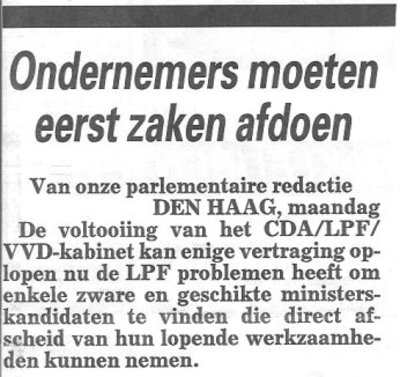 - U komt in de regering namens de LPF, bent u door Mat Herben gevraagd?'Matje Herben? Kom, schei uit, met Mat heb ik niks te maken. Nee, ik ben in eerste instantie door Pim gevraagd. Dus ik ben bij Matje langs geweest, mèt Sjon en ik heb gezegd van: joh, ik ben beschikbaar. Want Pim heb mij gevraagd. '