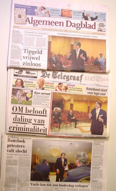 Woedend is'ie - Mike van der Molen, de uitsmijter/standup comedian uit Schiedam, tevens lijsttrekker van de LMM, de Lijst Mike van der Molen. "In alle kranten vanmorgen heel groot, met knallende foto's: Emile Ratelband treedt op voor een lege zaal. Schandalig! Ik voer al twee weken campagne, ik sta iedere avond voor een lege zaal, maar publiciteit ho maar! Ik heb ze allemaal gebeld, de Telegraaf, Algemeen Dagblad, ze hebben m'n hele schema, ik spreek van Workum tot Maastricht, maar als ik bel is 't van: 'Ja meneer Van der Molen, helaas, uw partij trekt te weinig belangstelling. Wij kunnen geen reporter sturen. En dat is voor u ook maar beter - als de mensen al die lege zalen zien, is dat voor u niet bepaald stemmentrekkend.' Sodeju! Die geflipte patatbakker staat voor een lege zaal en nou is 't ineens wereldnieuws! Vind je het gek dat het slecht gaat met de kranten! In die lege zalen zitten ook geen lezers! Ik ga gewoon door met de campagne. Gisteren zaten er drie mensen in een zaal voor achthonderd en alledrie gaven ze zich spontaan op als lid van de LMM. Je moet klein beginnen. En eind december zitten mijn zalen vol. Maar dan ben ik waarschijnlijk ook niet meer interessant voor die persmuskieten! Lege zalen willen ze zien... heb'ie ooit zoiets ondemocratisch meegemaakt!"
