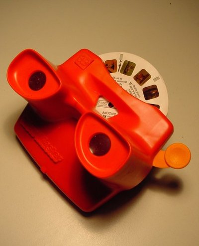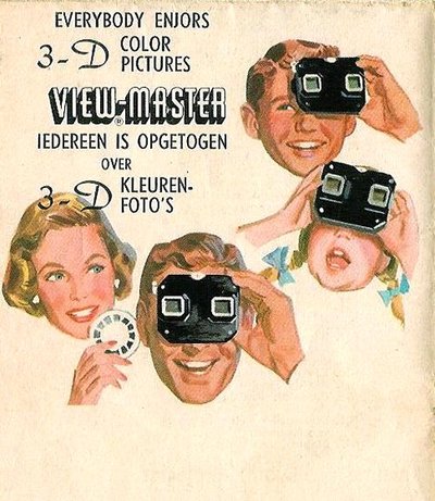 Je moest er een uur voor in de rij staan. Aan de ingang pakte je een brilletje met rode en groene glaasjes uit een grote bak. Binnen golfden de 'oohhh's' en 'aaahhh's' door de zaal. Ik herinner me een goochelaar die een balletje aan een touwtje de zaal in slingerde. De mensen deinsden van schrik terug in hun stoelen. Helaas moest je het brilletje bij de uitgang weer inleveren. De zware bakelieten ViewMaster die mijn vader toen kocht, kan ik niet meer vinden. Wel heb ik de lijst met schijfjes nog en aan de aankruisingen zie ik dat wij in huis hadden: