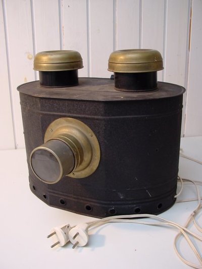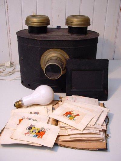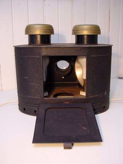 Mijn meest dierbare en met de grootste zorg omgeven apparaat. Een toverlantaarn is het geloof ik niet - bij ons thuis werd het steevast De Vergrotingskoker genoemd. Het apparaat stamt vermoedelijk uit de jaren dertig. Als mijn vader een voorstelling gaf, werd een laken tegen de huiskamergordijnen gespeld en het apparaat op twee meter afstand op tafel gesplaatst. Twee kolossale lampen van 200 Watt, elk met een eigen stekker, zorgden voor een helder beeld op het laken. De voorstelling bestond uit series Flipje, het Fruitbaasje van Tiel.