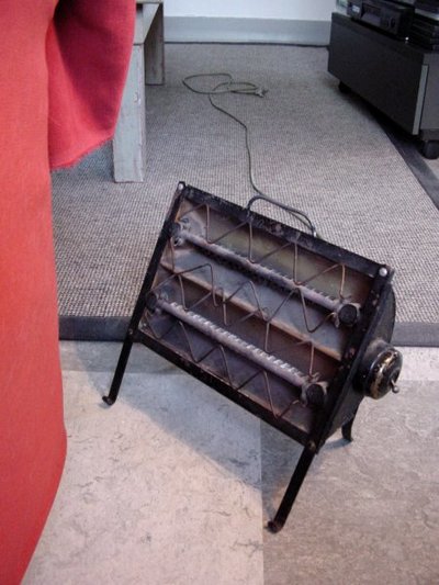 Uit de jaren dertig stamt het en het aanzetten was altijd een levensgevaarlijke onderneming. Eén van de twee elementen werkte nog, werd witheet en zou zeker nog een keer ontploffen, waarna het huis in vlammen op zou gaan. Te verwachten was ook dat het antieke knopje onder stroom zou komen te staan; ik durf het niet meer over te halen.