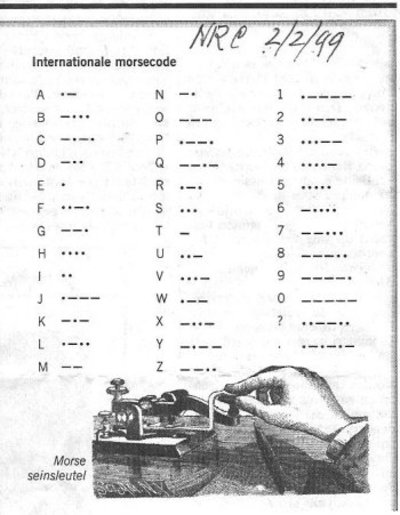 'Toen bracht ik boodschappen over met Morse.' Want zo is het, dames en heren. Om mijn Tweede Ster te behalen, leerde ik als tienjarige welp het Morse-alfabet uit het hoofd en was ik in staat met fluitsignalen een boodschap over te brengen. Nu u weer! Morse - de voorloper van de elektronische snelweg, werd officieel in 1999 ten grave gedragen, na 155 dienstjaren. Even doceren, kennis die ik ook heb moeten opzoeken: De portretschilder Samuel Morse (1791-1872) kwam in de jaren dertig van de negentiende eeuw op het idee elektrische pulsjes door een metalen draad te sturen en die te gebruiken voor communicatie over grotere afstand. Bij zijn dood lag over Amerika een netwerk van een miljoen kilometer telegraafdraad en nog eens 50.000 kilometer onder water. Rond 1900 bedacht Marconi, dat de pulsjes ook draadloos over de gehele wereld, via de korte golf, konden worden verstuurd. Noem je dat een elektronische snelweg? Jazeker, want of je een boodschap nu verstuurt in een code met eentjes en nulletjes of in punten en strepen (kort-lang) - het idee is hetzelfde. Iedereen kent het SOS-signaal (... ? ...) en de letter V (...-), het Victory-symbool van de geallieerden in de Tweede Wereldoorlog.