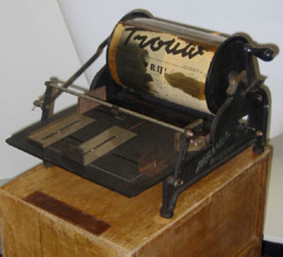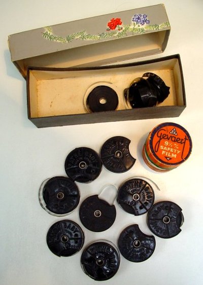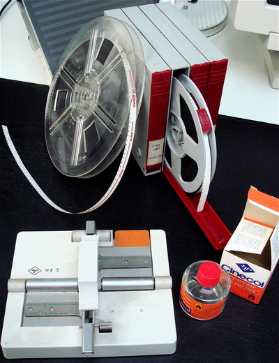 Vanaf de late jaren zestig werd amateurfilmen heel populair. Een camera kostte niet veel, maar een vakantiefilm van een halfuur liep in de papieren. Een rolletje bevatte enkele minuten 8 mm-film, na 'volschieten' stuurde je het op naar een laboratorium, dat het na ontwikkelen binnen enkele weken terugstuurde. Vervolgens moest je die filmpjes aan elkaar zetten - de gevorderde amateurs monteerden echte films, die een verhaal vertelden, soms met titels en muziek en al. Maar zo ver ging ik niet. Links op de voorgrond staat mijn plakpers. Wat zegt u, meneer? Plakte u die filmpjes zelf aan elkaar? Ja, jongelui, het ging zo: het ene eind van de film legde je in de onderste sleuf, het andere deel in de bovenste, door de 'brug' heen en weer te schuiven, schraapte een mesje beide uiteinden een beetje af. Dan smeerde je die afgevlakte eindjes in met plakmiddel, de bovenste sleuf draaide je op de onderste en je drukte de las flink aan en... maar jullie luisteren al niet meer, geloof ik. Ja hoor, meneer, het is heel interessant. Kunnen we die oude films zien? Lijkt ons heel erg gek. Ai! Nee, dat gaat helaas niet, ik heb geen projector meer. Ik bewaar stapels dozen met spoelen film uit de jaren zestig en zeventig en ik ben tot nu toe te labbekakkig geweest ze door een bedrijfje over te laten zetten - jaren geleden kon dat al op video en nu op DVD. (De 9,5 mm-filmpjes van mijn ouders uit de jaren dertig (zie Apparaten 21) zitten ook nog altijd in een doos. Schaamte!)