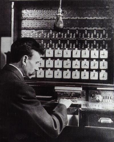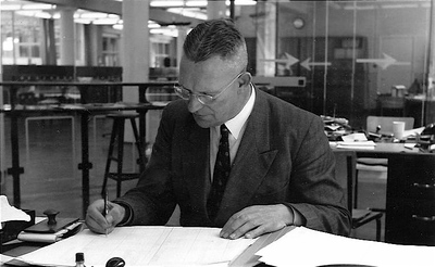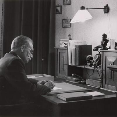 Mijn vader aan het werk op het GEB - het Haags Gemeentelijk Electriciteits Bedrijf. Veertig jaar was hij er ambtenaar, in een tijd dat het stroomverbruik van alle Hagenaars nog met de hand werd bijgehouden. Hoewel mijn vader hier een potlood hanteert, zal hij elke dag enkele uren met zijn vulpen hebben geschreven. Het apparaat waar het mij om gaat, staat naast zijn rechterhand op tafel. Ik ben opgegroeid met een inktlap - om de kroontjespen aan af te vegen - en een vloeipapiertje - om het natte opstel te drogen. Aan zo'n chique vloeiroller ben ik nooit toegekomen, omdat ook ik werd meegesleept door de revolutie die de ballpoint teweegbracht. Mijn vader gebruikte zijn vloeiroller veelvuldig, dat zie je aan de manier waarop een schoon stuk vervangbaar vloeipapier achteloos in de roller is geplaatst. Ik heb op het net naar vloeirollers gezocht en vond een foto van minister-president Willem Drees achter zijn bureau, waarop ook een vloeiroller pronkt. Twee foto's van schrijvende Haagse heren. Zelfde tijd. Zelfde vloeirollers. (Misschien noteert mijn vader op dat moment het stroomverbruik van de heer Drees. Zou kunnen.)