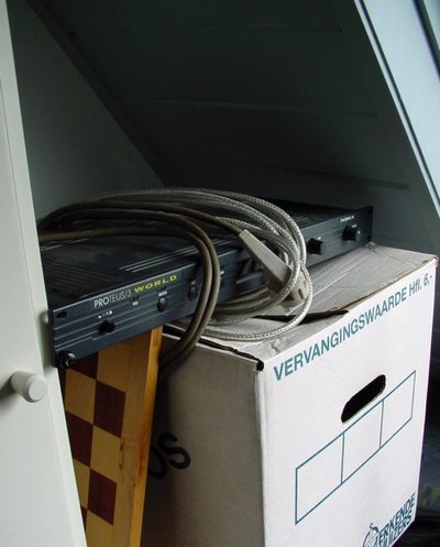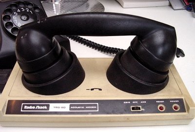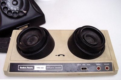 Toen ik in 1986/87 columns schreef voor de Volkskrant, gebruikte ik mijn eerste computer, een Tandy van RadioShack. Ik legde mijn teksten vast op een recorder en op hele grote flappen van floppy?s. Het zou het beste zijn als je erop leerde programmeren, zei men, maar daar bleek ik niet erg handig in. Met alleen een primitieve tekstverwerker kwam ik goed uit de voeten. Op de redactie van de Volkskrant leerde ik dat journalisten-op-pad hun kopij rechtstreeks vanuit hun huiscomputer naar de redactie zonden. Het systeem verkeerde in een experimentele fase. Dat wilde ik ook! Het faxapparaat was weliswaar een pril wonder, maar met het overseinen van bestanden hoorde je tot de voorhoede. En wie wil niet tot een voorhoede behoren? Ik kreeg van de Volkskrant een hulpkastje, dat ik helaas niet heb bewaard. Het is nu een prachtige curiositeit. Een lange zoektocht door de virtuele computermusea - de geschiedenis van de computer is nergens zo goed gedocumenteerd als op de computer - leverde gelukkig een plaatje op. Als m?n column klaar was, verbond ik het kastje aan de computer, zette mijn telefoontoestel ernaast, drukte de koppen van de hoorn stevig in de openingen bovenop het kastje en gaf het sein tot zenden. Met je oor op de hoorn, hoorde je hoe je tekst met veel gepiep en geraas werd doorgegeven. Als het gepiep ophield, belde ik de redactie met de vraag of de column was aangekomen. Dat moest, want in negen van de tien keer ontbrak de eerste of laatste alinea, of was middenin de tekst een blok raadselachtige tekens opgenomen. Vroeg de redacteur: 'Is je laatste zin: 'En toen draaide meneer Foppe zich om?' 'Nee', zei ik dan, 'de laatste zin is: 'En daar had hij niet van terug.' Er komen nog vier zinnen achteraan!'
