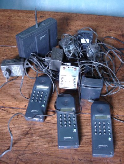 Nu ik ze voor de foto bij elkaar heb gelegd, moet ik toegeven dat ik een mobiele junk ben geworden. Er slingeren hier in huis acht afgedankte mobieltjes rond, waarvan meer dan de helft nog tot leven kan worden gewekt - er zit voldoende stroom in om de schermpjes te laten oplichten. Ik beken. Ik ga helemaal mee in de mobiele opfokkerij. Ik verslind de paginagrote advertenties, waarin de nieuwe modellen worden gepresenteerd.