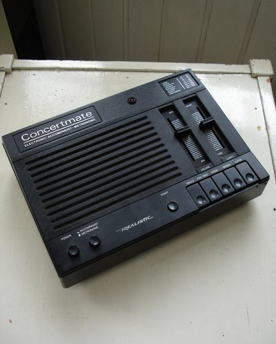 Deze eerste drumcomputer voor huiselijk gebruik kocht ik vijfentwintig jaar geleden in de Tandywinkel, ten behoeve van een tv-sketch, waarvan ik de inhoud ben vergeten. De Concertmate van Realistic was in twee functies bruikbaar: als metronoom en als 'Electronic Accompanist'. Drumcomputer is een groot woord voor dit kastje waaruit een blikken geklik en getik klonk, dat in de verre verte niets met trommels of bekkens van doen had. Maar je kon menig familielid of bezoeker verrassen door je bij je pianospel te laten begeleiden door een Waltzrhythm uit de Concertmate, of door de toetsen Rock, Bossa of Latin in te drukken - ritmes die je ook nog in tempo kon variëren. 'Nou ja! Ze vinden wat uit tegenwoordig!' Dit doosje heeft voor veel muzikale ellende gezorgd. Met de uitvinding van de drumcomputer brak een lange periode van fundamentele kaalslag in de populaire muziek aan. Het ritme - fundament van goede popmuziek - kwam lange tijd uit een doos en de veronachtzaming van 'echte', levende drums leidde tot morsdode muziek, die mij zelden tot dansen heeft gebracht. (Maar als ik een nummer opzet met een echte, swingende drummer, spring ik - als niemand het ziet - nog als een oude aap door de kamer.) Het evenwicht tussen echt en synthetisch is nu enigszins hersteld, maar nog is er geen popdrummer die in de schaduw kan staan van welke jazzdrummer dan ook. (Behalve Charlie Watts van de Stones, die ook een aardig potje jazz kan slaan.)