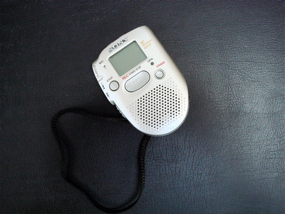 Om de zoveel jaar, als een nieuwe versie op mijn pad komt, ga ik enthousiast voor de bijl en moet ik het apparaat zo snel mogelijk hebben. De voice- of memorecorder. En elke keer neem ik me voor het ding optimaal te gaan gebruiken. Vanaf het moment van aanschaf zal ik het 'voor altijd' vers geladen bij me dragen. Want ik ga 'invallen vastleggen'. Een interessante gedachte, een mooie zin, een idee voor een roman, een pakkend melodietje, een gekke stem, een zojuist opgevangen gesprek, een regel waaruit niet alleen een gedicht maar misschien wel een hele bundel zal voortvloeien, een spontane improvisatie - alle briljante invallen leg ik onmiddellijk vast, een halve seconde nadat ze vers uit het brein zijn geborreld. En thuis luister ik het bandje-van-de-dag af en noteer ik de meest briljante uit de stroom invallen. Zo zou het moeten, maar zo gaat het niet. Afgezien van het feit dat ik heel wat minder briljante invallen krijg dan ik zou willen, blijkt het in de praktijk onmogelijk ze aan de voicerecorder toe te vertrouwen. Haal ik, als ik in tram of trein zit, mijn recordertje tevoorschijn om er iets in te prevelen? Ik niet. En zingen in het openbaar is al helemaal uitgesloten. Tegenstem: ja, vroeger werd je wellicht voor interessantdoener versleten, maar nu, met het massale mobiele bellen in het openbaar, valt het recordertje toch niet zo op? Dat dacht u. Maar ik haal de aanstellers - managerstypes die hun secretaresses zogenaamd dringende brieven zitten te dicteren - er zo uit. Bovendien is een apart apparaat niet meer nodig - je belt met je mobiel naar je eigen nummer en je spreekt na de pieptoon je briljante inval in. In mijn eerste voicerecorder, een Sanyo M1118, draaide een cassettebandje en het is zeker 25 jaar oud. Een dikke knol, die niet in een binnenzak past. Ik kan me niet herinneren er ooit een briljante inval op te hebben ingesproken. Het apparaat heeft een 'voice activated system'. Moest het standby staan en ging het draaien als je erin sprak? Ik vrees dat ik het apparaat voornamelijk heb gebruikt om weer eens aan verblufte toehoorders te demonstreren dat 'het met de tegenwoordige techniek heel hard gaat'. De kleine digitale versie van Sony was onweerstaanbaar. Geen bandjesgespoel - je kon er gedurende uren je briljante invallen op kwijt. En die waren ook gemakkelijk weer terug te vinden. Met dat apparaatje heb ik op lange fietstochten - heel vroeg in de ochtend, niemand op de weg - wel enkele malen uitzinnig gezang en onzinnig gebral opgenomen. Misschien staat het er nog op, maar ik durf het apparaatje niet op te laden en af te luisteren. Want briljant zal het zeker niet zijn. Toen bleek dat op mijn eerste iPod een microfoontje kon worden aangesloten, was ik er weer als de kippen bij. Het is een gevoelig microfoontje en op de iPod is nu plaats voor een eruptie van briljante invallen die gerust een week - dag en nacht - mag aanhouden. Maar ik ben inmiddels overgestapt op de iPodVideo en daar heb ik nog geen microfoontje voor gezien. Bij deze drie voicerecorders wilde ik het voorlopig laten. En komt er hopelijk binnenkort weer eens een briljante inval bij me binnen, dan noteer ik die in mijn nu nog lege opschrijfboekje van Moleskine dat ik, in een binnenzak gestoken, altijd bij me draag.