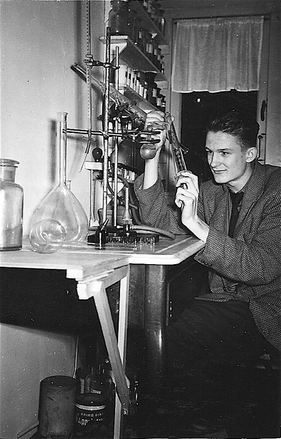 Wat me in scheikunde zo aantrok, kan ik me niet meer indenken. Waarschijnlijk koesterde ik het romantische beeld van eigenzinnige geleerden die in hun laboratorium geheimzinnige proeven doen en de mensheid versteld doen staan met hun vondsten. De tegenpool van de waanzinnige professor Lupardi? Mijn vader - groot natuurkenner - had er zich bij neergelegd dat ik zijn droom niet zou waarmaken; ik interesseerde me niet voor de natuur en werd dus geen landbouwkundig ingenieur. Maar de foto bewijst dat hij mijn keuze voor de scheikunde van harte ondersteunde. Hier zit ik in mijn eigen laboratorium, dat was ingericht in een kamertje op zolder. Ik deed er de proeven na uit de scheikundelessen. Mijn lab? Door de foto goed te bestuderen begrijp ik nu dat het ook mijn vaders laboratorium was. Hij had gezorgd voor de flessen en potten met chemische stoffen en het rek tegen de wand. Hij timmerde het bijtafeltje tegen de oude badkamertafel met marmeren blad. Hij wist reageerbuizen, retorten, pipetten en statieven te versieren op 'de zaak', het gemeentelijk electriciteitsbedrijf, waaraan ook een laboratorium was verbonden. Hij legde een gasleiding aan, zodat ik met een bunsenbrander de vloeistoffen kon verwarmen. Ik herken ook het zelf vervaardigde detail waarop hij zo trots was: het rode lampje dat ging branden als de gaskraan werd opengedraaid. Ook had hij buiten, op de gang boven de deur van het lab, een rode waarschuwingslamp aangebracht, die aangaf dat niemand onverhoeds mocht binnentreden als de vloeistoffen stonden te pruttelen en de mengproeven een aanvang namen, soms gepaard gaand met rookontwikkeling en ontploffingsgevaar. Ik herken het pronkstuk: het destillatie-apparaat, een wonder van glasblaaskunst. (Het steekt achter mijn rechterhand diagonaal de ruimte in.) Een lange buis, met daarin een ander, spiraalsgewijs gedraaid glazen kanaal. Wat graag kwamen jongens uit de klas bij mij hun scheikundehuiswerk maken. O ja, er hing ook een bord, door mijn vader met groene schoolbordenverf bestreken, waarop wij met krijt de chemische formules konden uitwerken. En, schiet me nu te binnen, hij had zelfs een kap gemaakt die giftige dampen kon afzuigen. In de vijfde klas werd duidelijk dat de b-richting hoofdzakelijk minder romantische vakken omvatte. Wis- en natuurkunde gingen me veel moeilijker af. In dat jaar werd ik gegrepen door de gedichten van Lucebert en Remco Campert en de romans van W. F. Hermans. Met veel bijlessen en geploeter haalde ik het diploma hbs-b, waarna ik Nederlands ging studeren aan de Haagse School voor Taal- en Letterkunde. En ook dat kreeg de goedkeuring en medewerking van mijn vader, die immers zelf korte verhalen en kronieken in het personeelsblad schreef. Weer zo'n romantische misvatting: als je zelf gedichten probeert te schrijven Nederlands gaan studeren . Toen ik binnen een jaar de studie staakte en me aanmeldde bij een opleiding tot radiocabaretier, was mijn vader het daar niet mee eens. Het verdere verloop van mijn werkzame leven heeft hij niet mee kunnen maken. Hij kreeg de ziekte waarvan toen niemand de naam durfde noemen.