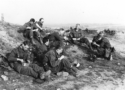 Uit deze 'pannetjes' heb ik gedurende een kleine twee jaar tientallen keren gegeten tijdens het uitvoeren van (denkbeeldige) veldslagen op de slagvelden van de Koude Oorlog. Deze Mess Tin Set is al tientallen jaren in gebruik bij de legers van vele landen en er moeten er miljoenen van in omloop zijn. Iedere soldaat draagt de invouwbare blikken in zijn/haar ransel standaard mee. Dit exemplaar staat bij mij op zolder voor het grijpen. Als ik ooit nog 's eten moet halen in een gaarkeuken - maar laten we hopen dat dit nooit... enzovoorts - klap ik mijn blikken uit om er twee kwakken eten in te kunnen ontvangen. Ik heb een bewijsfoto gevonden. Het is etenstijd, we zijn ergens in Frankrijk op verkenning. Uw hoofdredacteur, tweede van links op de voorgrond, zit gebogen over zijn blik. Hij heeft uren gelopen en schrokt het eten naar binnen. Mag hij nog een keer halen bij de veldkeuken?
