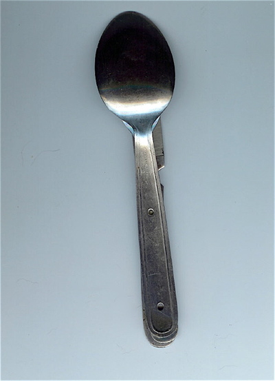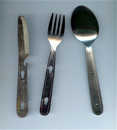 Biesloglezers laten me weten: 'Ja, als je die Mess Tins laat zien, waarom dan niet het bestek?' Ik herken ze meteen: de lepel, waarop het mes (annex fles- en blikopener) en de vork werden vastgeklikt. Het bestek moest in een zakdoek gewikkeld in de Mess Tins worden gepakt, want anders kon de vijand je al op een kilometer afstand horen aanrammelen.
