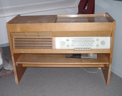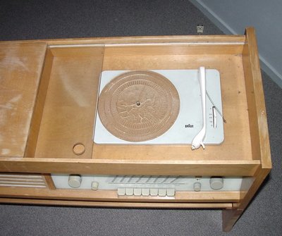 Dit prachtige meubel staat bij mij achteloos op zolder: de radio/grammofoonspeler van Braun uit 1956. In het midden van de vorige eeuw werden ook mijn ouders aangestoken door de golf van moderniteit die over het land sloeg. De zware meubelen - huiskamertafels en dressoirs met balpoten - werden rigoureus uit onze huiskamer verwijderd en vervangen door Pastoe-meubilair - een antracietkleurig tafelblad met stalen poten en met rood plastic beklede stoeltjes - tapijten werden cocosmatten - zwart met gele motieven - en alle deuren werden strak getrokken door ze met platen te betimmeren. Als klap op de vuurpijl kochten mijn ouders dit pronkstuk. Het toppunt van ?modern?. Het zou in menig interieur van nu niet misstaan.