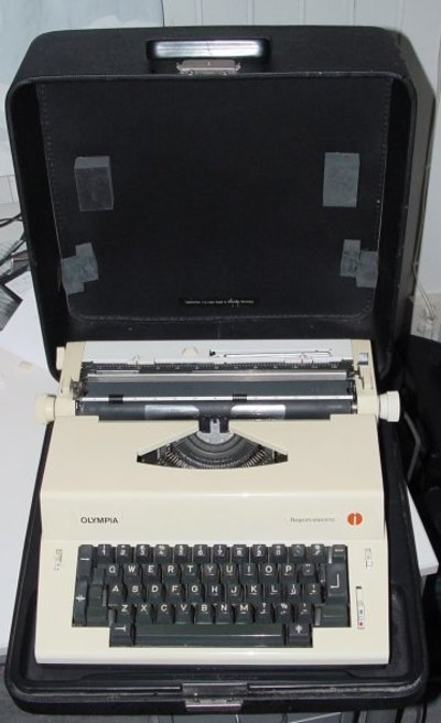 In The Guardian stond gisteren een mooi fragment uit een boek van Paul Aster: The Story Of My Typewriter. Over de verhouding met zijn oude Olympia schrijfmachine, die nu al 26 jaar duurt. Auster houdt vol en heeft vijftig linten in voorraad, voor het geval ze niet meer worden gefabriceerd. Na lezing dacht ik: heb ik niet ergens... Ze stond diep weggeborgen in een gangkast, de elektrische van Olympia - mijn tweede schrijfmachine; de luxe stap voorwaarts, na jaren gerammel op mijn (niet-elektrische) Oost-Duitse, zeer goedkope, met een afbetalingsregeling aangeschafte Erika. Ik deed de koffer open en herkende haar nauwelijks! Na veertien jaar deed het weerzien me niets.